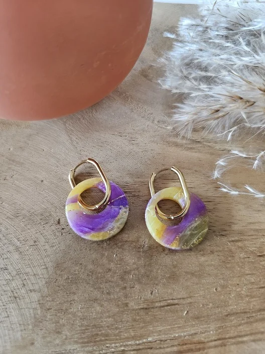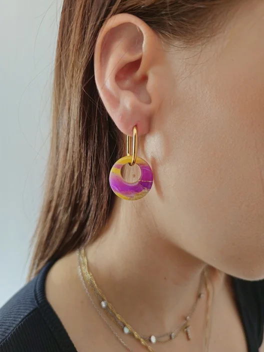 Dans le jardin enchanteur où Esmeralda se promène, chaque fleur semble chanter une symphonie de couleurs. Esmeralda, avec son esprit libre et son cœur vibrant, inspire ces boucles d’oreilles circulaires. Les nuances de jaune et de violet se marient harmonieusement, reflétant la vivacité et la profondeur de son caractère. Les anneaux entourent ces couleurs, symbolisant l’unité et l’éternité.
