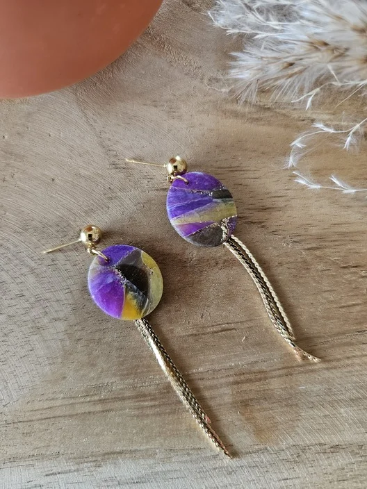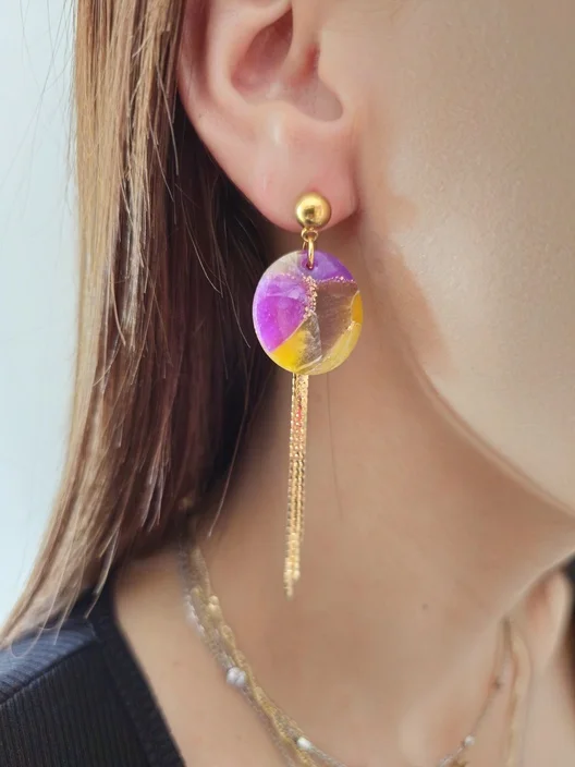 Inspirées par les couchers de soleil éclatants, ces boucles d’oreilles pendantes capturent la magie du jaune doré et du violet royal, ajoutant une touche de sophistication et de mouvement à votre look.